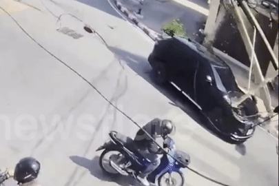 Cột điện bị kéo đổ đè trúng ô tô đang di chuyển trên đường