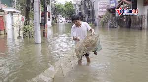 Nước lũ ngập sâu, dân Hà Nội chèo thuyền, ra phố giăng lưới bắt cá