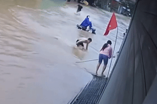 Cô gái bị dòng nước lũ cuốn trôi được 2 nam thanh niên giải cứu kịp thời