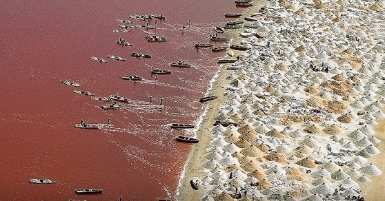 Hồ nước màu hồng ở Senegal có độ mặn gấp 10 lần so với các đại dương bình thường, đặc biệt, mặn hơn cả Biển Chết. Hàng ngày, người dân nơi đây vẫn mạo hiểm khai thác muối...